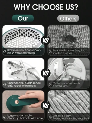 •  سهلة التنظيف: سهلة الاستخدام، ببساطة قم بتشغيلها وتشغيلها على القماش المطلوب، بتمريرة واحدة بسيطة سترى إزالة جميع كرات الوبر الزائدة. يتم تثبيتها في مساحة التخزين القابلة للإزالة حتى تتمكن من تنظيفها بسهولة.